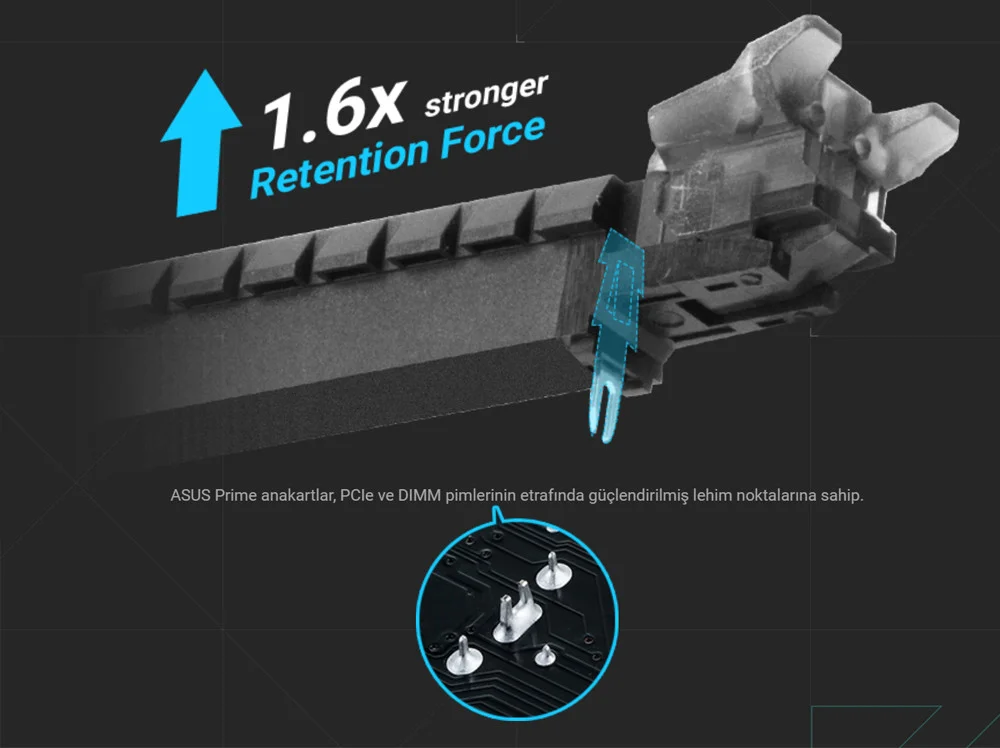 Güçlendirilmiş PCIe slotu hasarları önlüyorSafeSlot Core, ASUS'a özel PCIe yuvasıdır. Anakarta özel bir kanca ile tutturulmuş, güçlendirilmiş bir tasarım barındıran SafeSlot Core, standart genişletme yuvalarından 1.6 kat daha fazla eğilme, 1.3 kat daha fazla kırılma direnci sağlar.