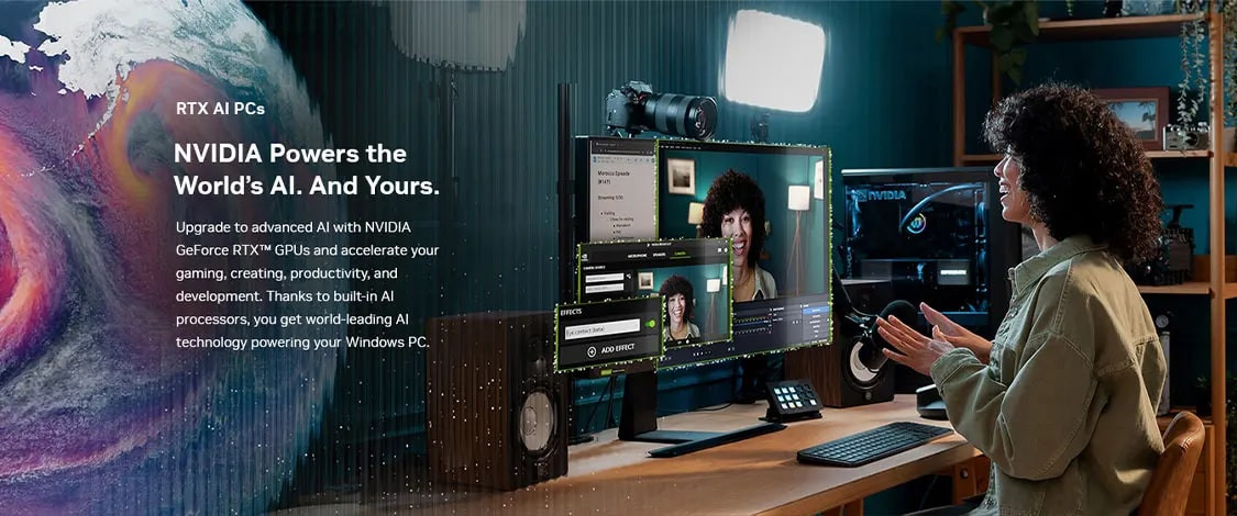 NVIDIA GeForce RTX GPU'lar ile gelişmiş yapay zekaya yükseltin ve oyun oynama, oluşturma, üretkenlik ve geliştirme süreçlerinizi hızlandırın. Yerleşik yapay zeka işlemcileri sayesinde Windows bilgisayarınıza güç veren dünya lideri yapay zeka teknolojisine sahip olursunuz.