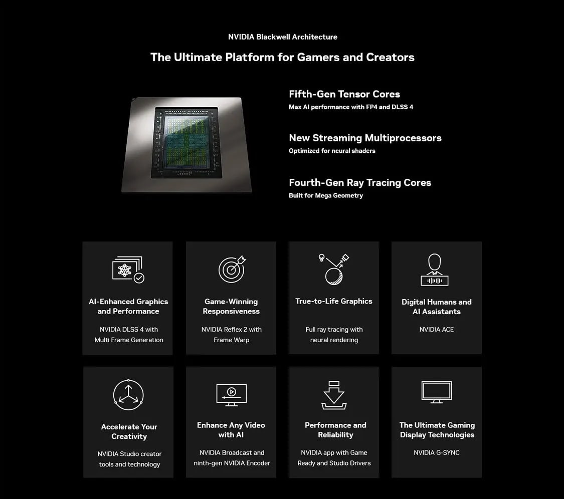 NVIDIA Blackwell mimarisi, tam ışın izlemenin oyunun kurallarını değiştiren gerçekçiliğinin kilidini açar. Dördüncü nesil RT Çekirdeklerine sahip GeForce RTX 50 Serisi ve beşinci nesil Tensor Çekirdekleri ile hızlandırılmış çığır açan nöral işleme teknolojileri tarafından desteklenen benzersiz hızda sinematik kalitede görselleri deneyimleyin.