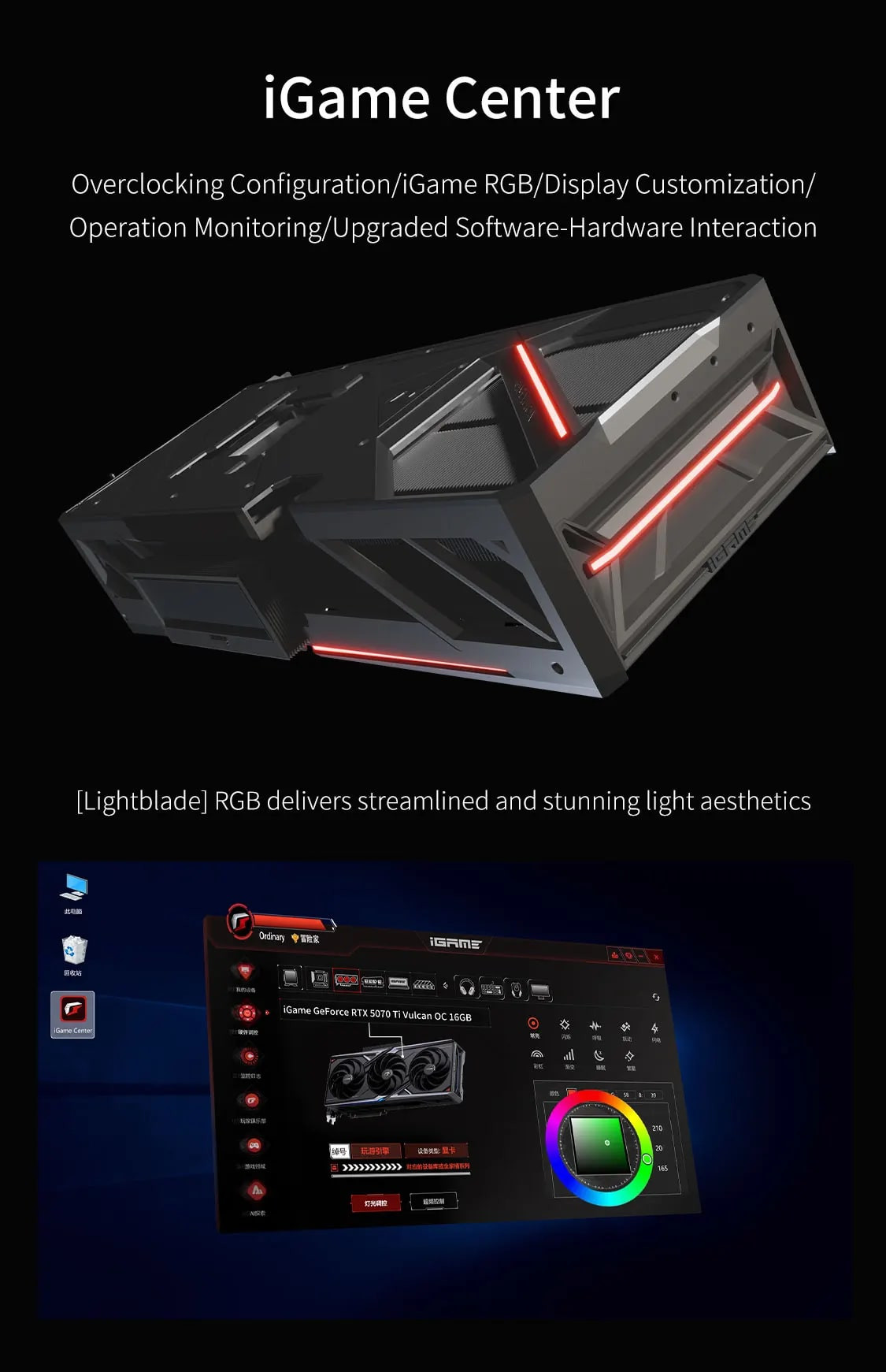 Hız Aşırtma Konfigürasyonu, iGame RGB, Özelleştirme Görüntüleme, Operasyon izleme, Yükseltilmiş Yazılım, Donanım Etkileşimi.