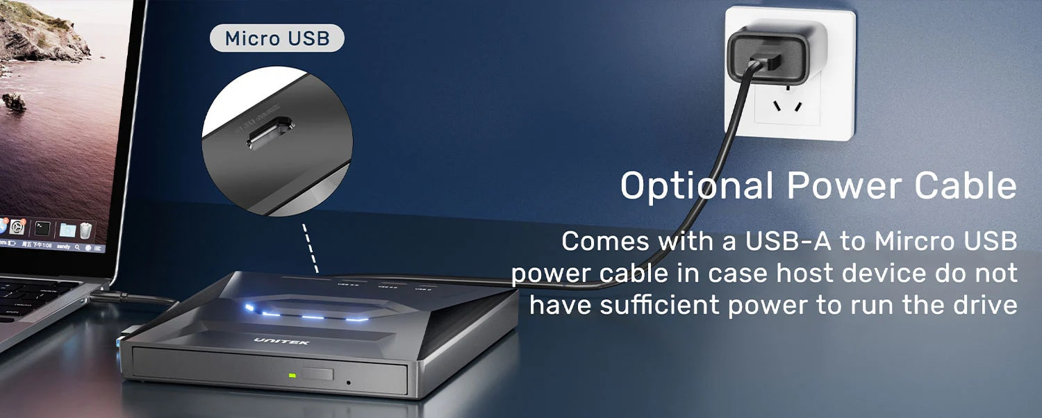Ana cihazın sürücüyü çalıştırmak için yeterli güce sahip olmaması durumunda bir USB-A/Mikro Usb güç kablosu ile birlikte gelir.