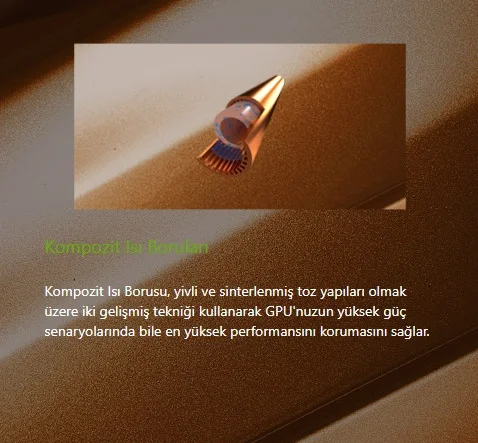 Kompozit Isı Borusu, yivli ve sinterlenmiş toz yapıları olmak üzere iki gelişmiş tekniği kullanarak GPU'nuzun yüksek güç senaryolarında bile en yüksek performansını korumasını sağlar.